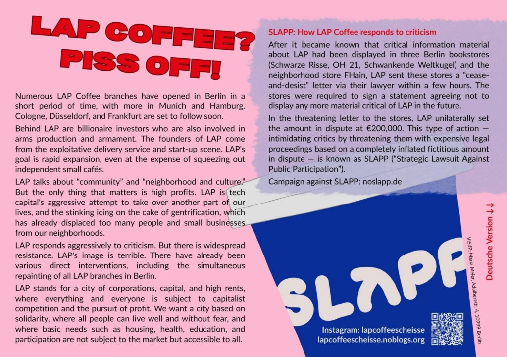 Wir haben neues kritisches Material zu LAP (Flyer, Aufkleber, Plakate). Dieses liegt schon an verschiedenen Orten in der Stadt aus. Wenn ihr auch Material wollt, schickt uns gerne eine kurze E-Mail. SLAPP LAP Coffee? Piss Off!